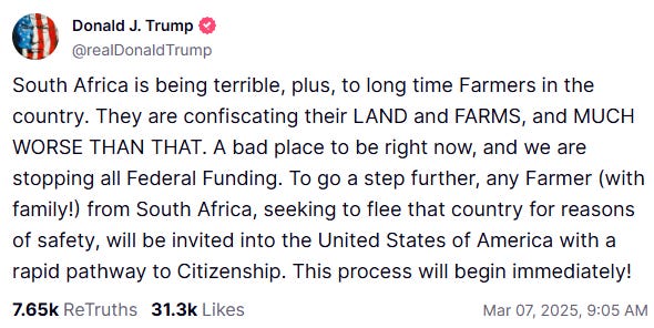 Take Elon Musk, for example— another bleeding heart for white grievance and reparation campaigns. When it was brought to his attention that white South Africans might have to return land that was stolen by their ancestors under the doctrine of Manifest Destiny (white supremacy), he immediately called Co-President Trump. And by decree, a “pathway to citizenship” was opened for members of Cecil Rhodes’s so-called “Anglo-Saxon Empire” — at the behest of the king.